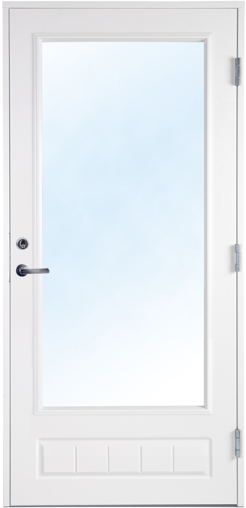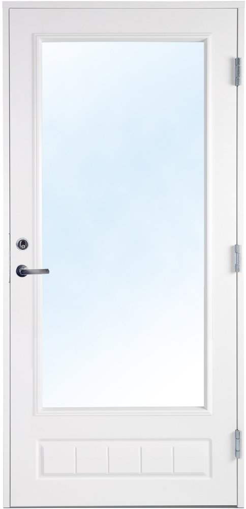 Dörren är dekorerad nedtill på både in- och utsida. Fönstret är en 2-glas isolerruta med Argon vilket ger ett lågt U-värde. Fönstret är på denna dörr av säkerhetsglas, vilket Boverket rekommenderar för glasrutor lägre än 60 cm från marken.