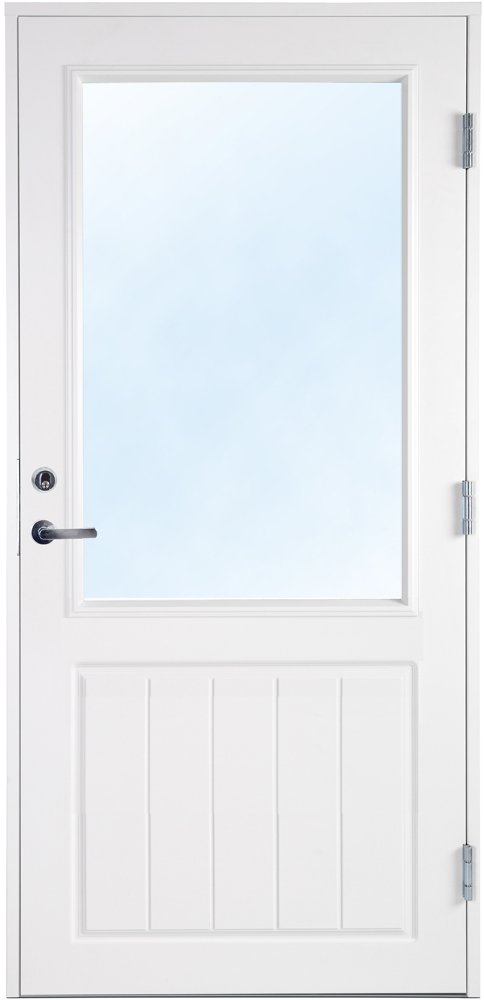 Dörren är dekorerad nedtill på både in- och utsida. Fönstret är en 2-glas isolerruta med Argon vilket ger ett lågt U-värde.