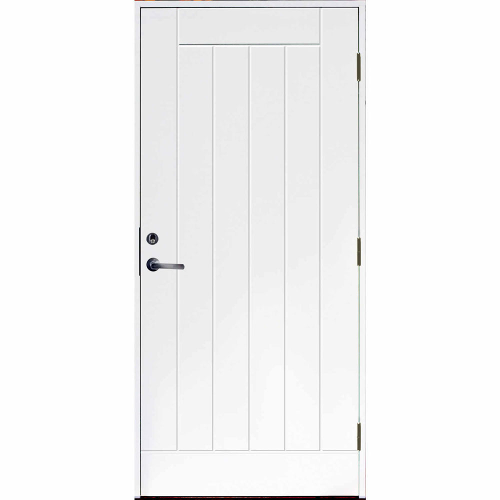 Dörren har en stomme i dubbel limmat ramträ i furu. För att stommen ska vara så stark som möjligt och inte slå sig limmar man ihop smalare furu-längder. Stommen har innanför ramen modern värmeisolering i 50 mm cellplast (EPS 200). En 0,5 mm aluminiumplåt täcker både in- och utsida för maximal stabilitet och täthet. Utanpå denna aluminiumplåt har dörren en specialframtagen HDF-panel som är vattenfast och anpassad för vårt klimat. Dörrtröskeln är oljebehandlad och av det hårda träslaget ek, som både är snyggt och tål en hel del tuffa tag. Dessutom är tröskeln försedd med utvändig aluminiumlist som skydd för väta. Dörrkarmen är inkluderad och tillverkad i furu, vilken kommer i samma färg som dörrbladet.